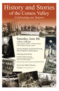 Twelve 3'x4' display boards, poster and invitation design - celebrating the history of the Comox Valley through stories from seniors.